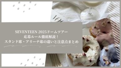 CONCERT SEVENTEEN日本ツアー2025/応募ルール徹底解説!スタンド席・アリーナ席の違いと注意点まとめ 2025年開催のSEVENTEEN日本ツアーのチケット応募ルールを徹底解説。スタンドとアリーナの違いや入れ替え応募の仕組み、最大応募可能数、会場別日程まで網羅。応募時の注意点も詳しく紹介しています。初めて応募する方や当選確率を上げたい方必見です。 2025.08.22 CONCERT